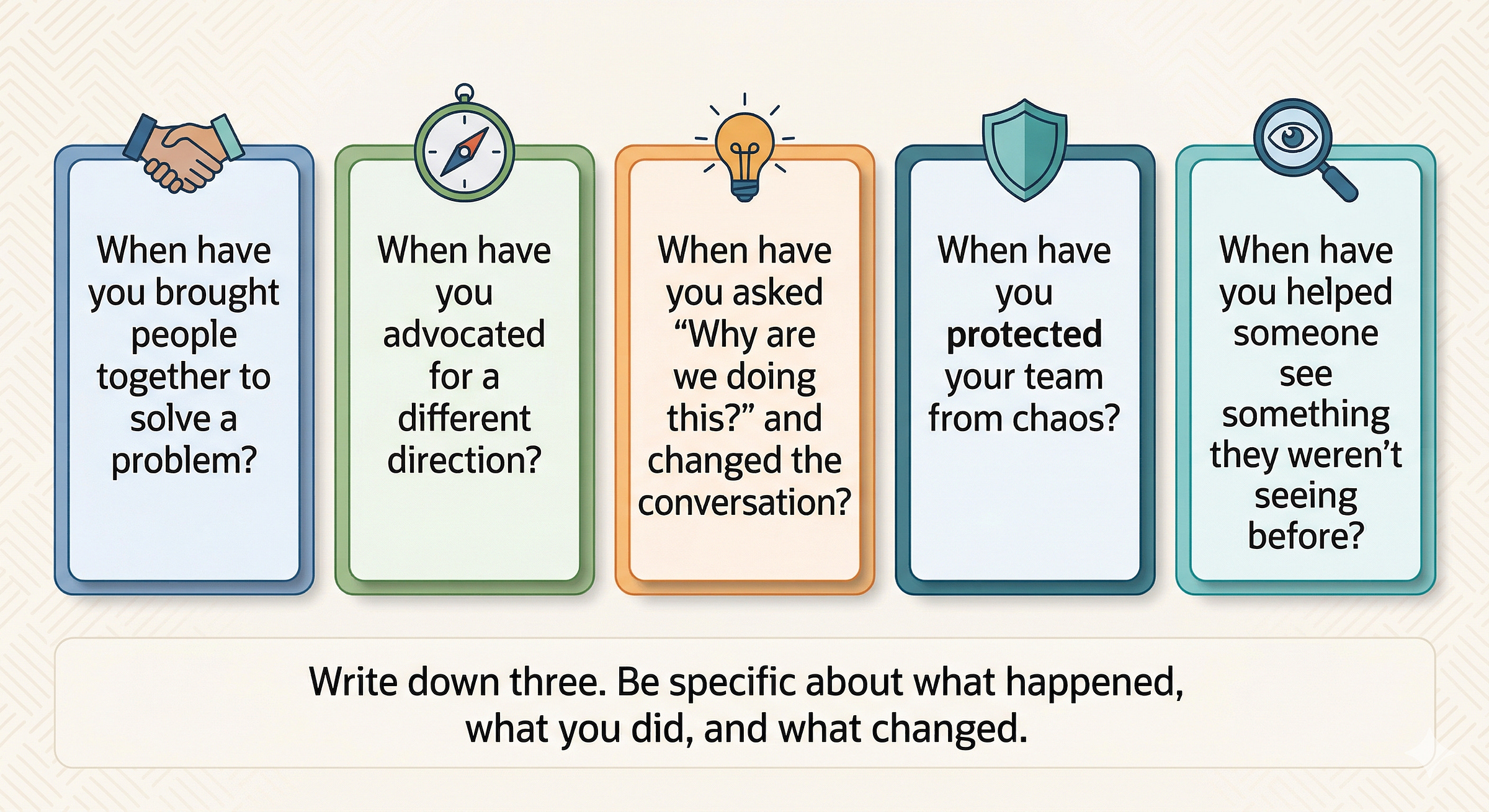 Think back to the last month. When have you brought people together to solve a problem, even informally? When have you advocated for a different direction, even when it was risky? When have you asked “Why are we doing this?” and actually changed the conversation? When have you protected your team from chaos, or helped someone see something they weren’t seeing before