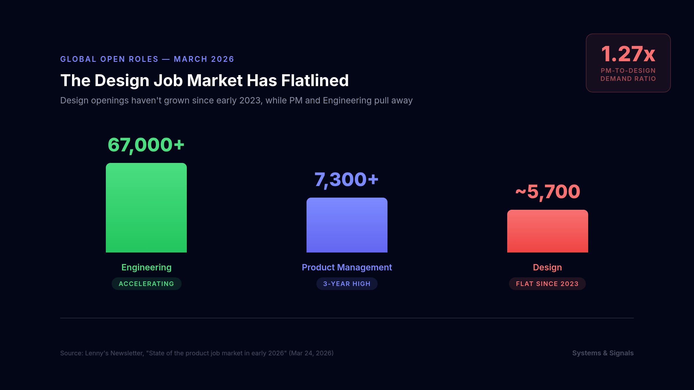 This is the one I kept coming back to. Lenny Rachitsky published his latest State of the Product Job Market report, and the numbers confirm something a lot of us have been feeling but couldn’t put data to. Design roles have been essentially flat since early 2023, about 5,700 open globally. That number hasn’t moved. Meanwhile, PM openings surged past 7,300 and engineering is at 67,000-plus. The demand ratio between PMs and designers has flipped for the first time: in mid-2023, there were more open designer roles than PM roles. Now PMs lead at 1.27x.