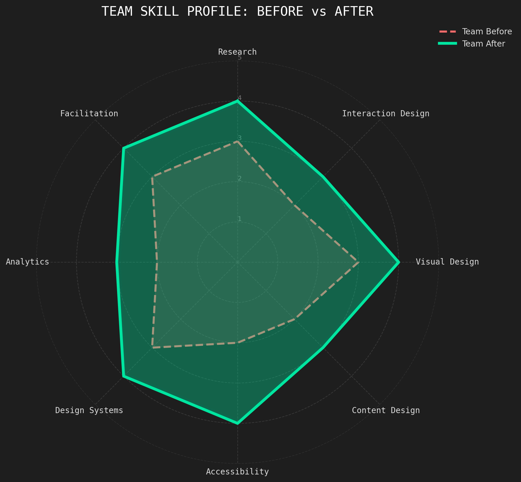 At multiple companies, I have used this approach to establish new design capabilities and teams — not because they were on a roadmap, but because the people and skills were there, waiting to be surfaced and directed.