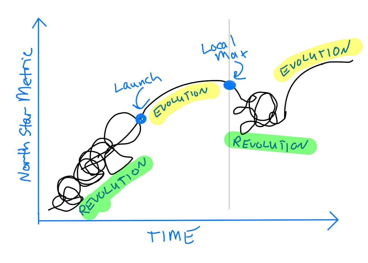 Continuing to iterate on a design that has hit its local maximum is akin to squeezing a rock to get water: you’re just wasting your time and energy. What if the local maximum is hit early on in the product’s lifecycle and outcomes must improve? Time to start a revolution.