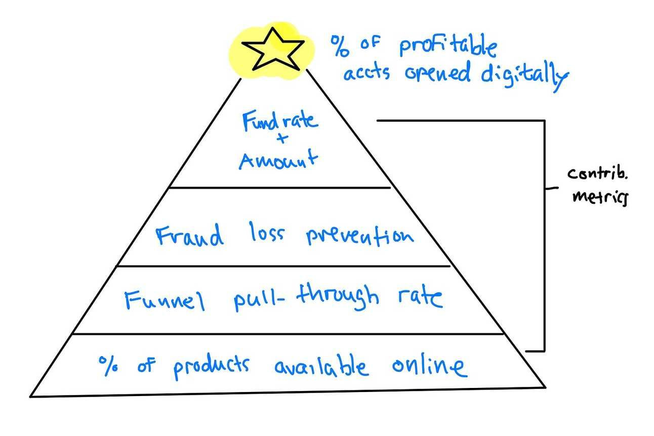 Let’s take a look at an example from financial services, a common and critical part of a product’s user journey: account opening, with a North Star of percentage of profitable digital account opens in relation to branch opens: