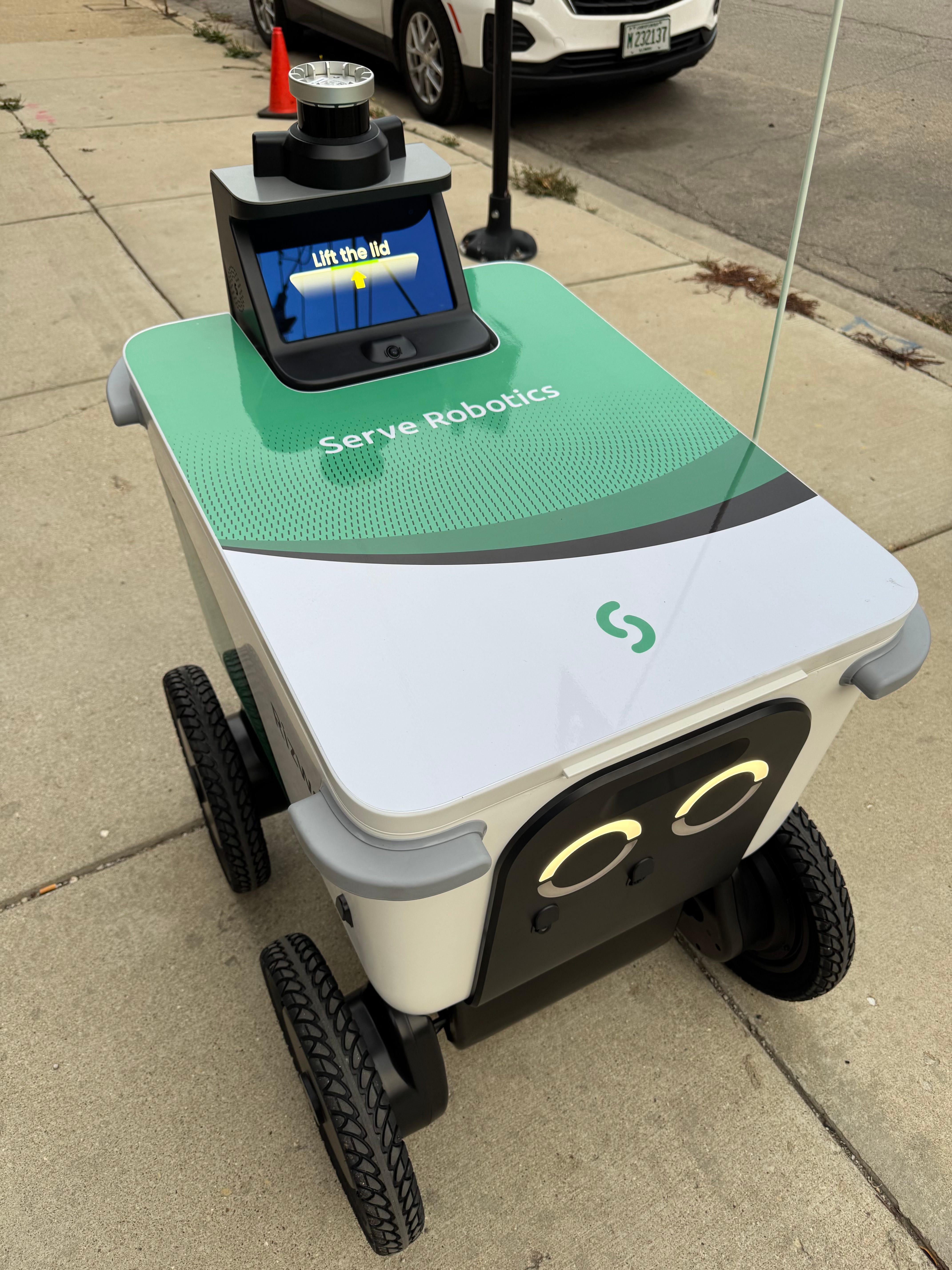 It’s Sunday afternoon, football on, and I’m about to have lunch delivered by a robot. Somewhere in a nearby parking lot, a little boxy vehicle with two glowing ring lights — “eyes,” I guess — is navigating crosswalks to bring me a chicken wrap I could’ve made in ten minutes. It’s cute, because it was designed to be. A friendly, anime-eyed courier rolling toward me on four wheels, making it easy to forget that it took a job from an actual human being.