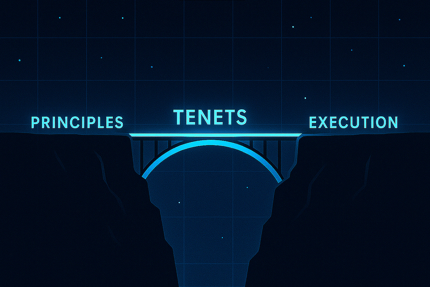Tenets are sharp, contextual, and highly opinionated. They ladder up to principles and provide a lens for making real-world tradeoffs. Example: “Users must opt into complexity.”